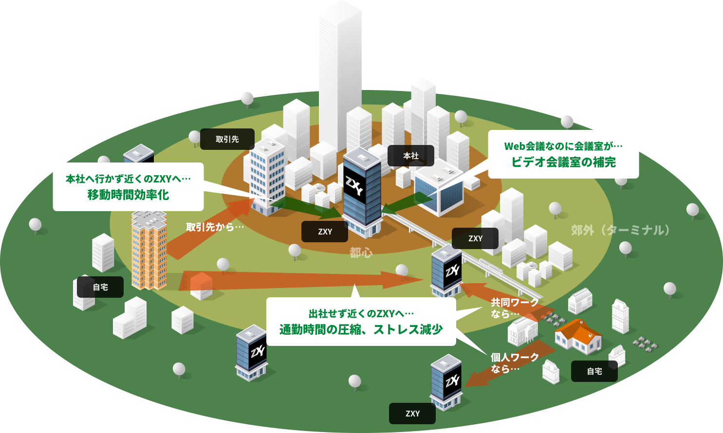 複数のワークプレイス(本社オフィス、在宅勤務、「ZXY」)を組み合わせたオフィス運用で、企業が抱える働き方に関する課題を解決します。